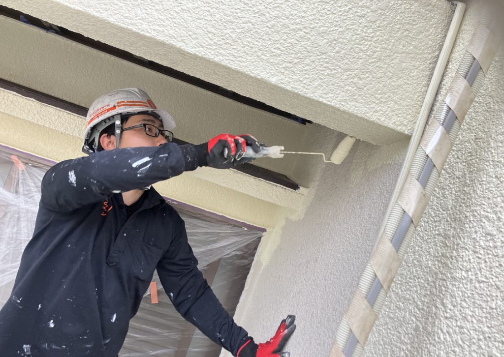 全体をしっかり高圧洗浄したら、1回目の塗装です。下塗り(したぬり)といいます。外壁の種類により、下塗り塗料はシーラとフィラーと2種類の下塗り塗料に分かれますが下地材に適した塗料を使用します。原則、下塗り、中塗り、仕上げ塗り(上塗り)をしっかり、たっぷり 3回塗りです。吸い込みが激しい場合は2回塗る時もあります。