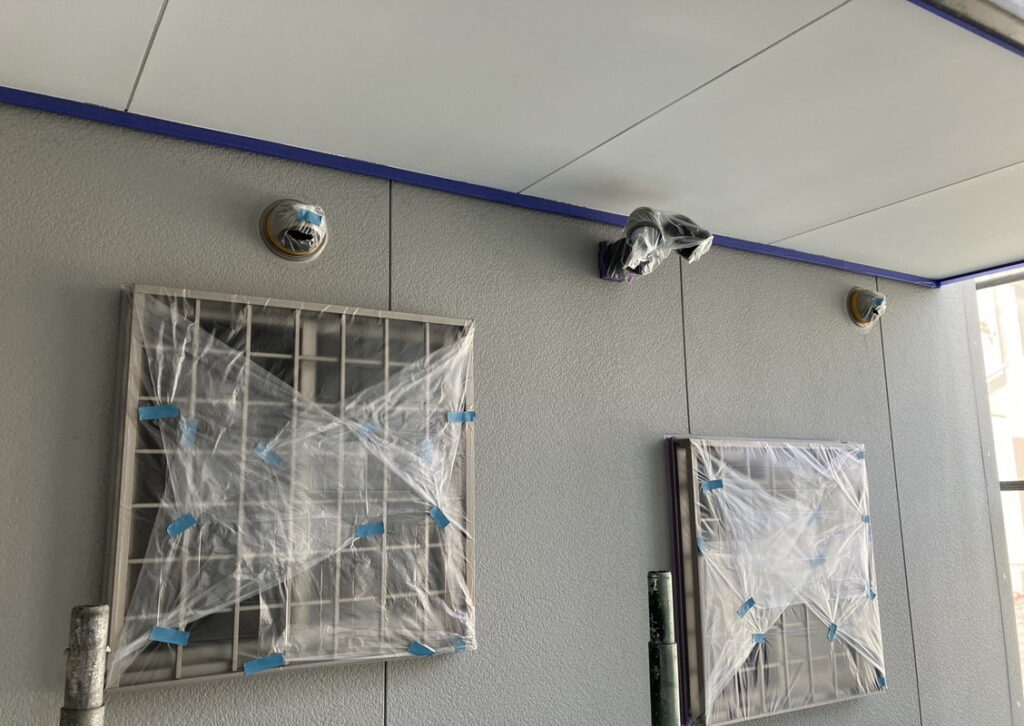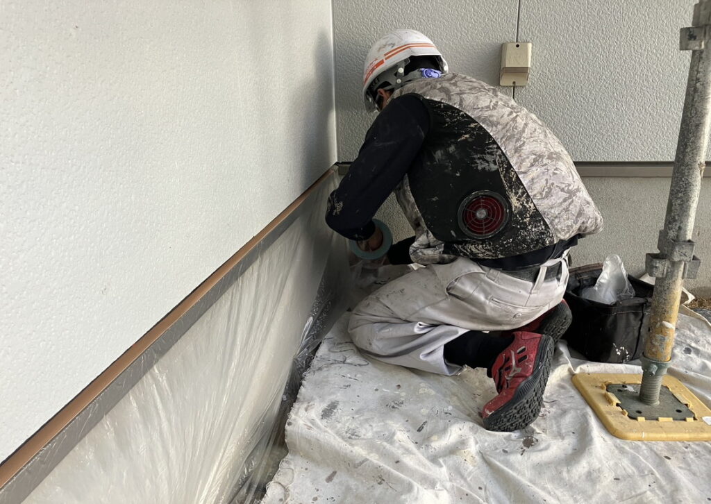 塗料が付着しないようにきっちりと丁寧に養生を行っております。