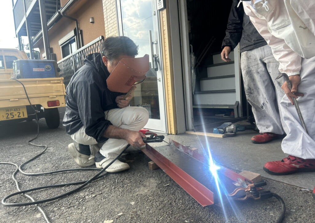 現場親方ブログ2025.11.07伊丹市 O様 溶接もおてのもの♬溶接こんにちは!にこにこ伊丹店です本日は伊丹店にて O様のお宅で使用する縞板の溶接を会長の長石が行っている場面を撮影しました。久々の溶接ですが 長石自ら率先躬行で溶接を行っております。