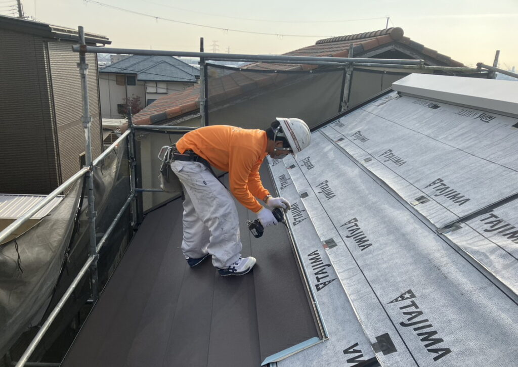 現場親方ブログ2025.12.02宝塚市 O様 ガルテクト工事本体葺き・棟下地取付こんにちは!にこにこ屋根班です本日のお写真は宝塚市にお住いのO様のお宅にてガルテクトの本体葺きと棟下地取付を行っております。一枚一枚丁寧に葺きを行っております。