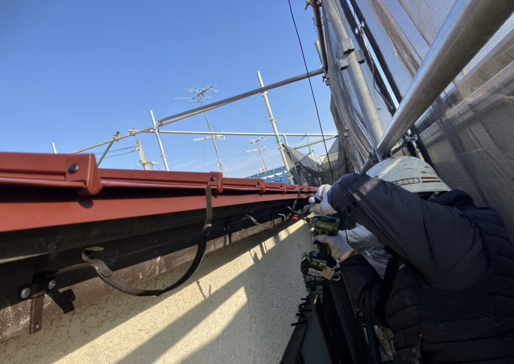 現場親方ブログ2026.02.14川西市 M様宅 軒金具 軒樋取付軒金具取付こんにちは!屋根班です本日は川西市にお住いのM様のお宅にて軒金具取付と軒樋を取り付けております。しっかりと固定するように金具を取り付けていきます!!