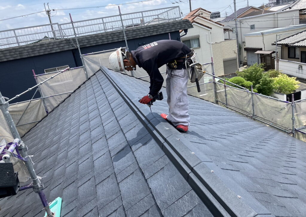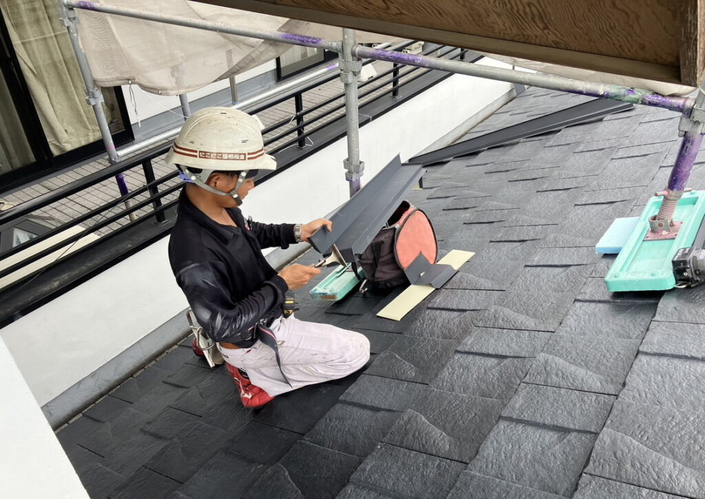 現場親方ブログ2025.06.26伊丹市 Y様宅 屋根工事雨押え板金の加工・棟取り付けこんにちは!にこにこリフォーム 伊丹店です本日は伊丹市にお住いのY様のお宅にて 雨押え板金の加工と棟の取り付けを行っております。雨押え板金とは、1階の屋根と外壁の接合する箇所に取り付ける板金部材です。一軒一軒ずつ違うのでお客様の家に合うようにその場で加工をいたします。