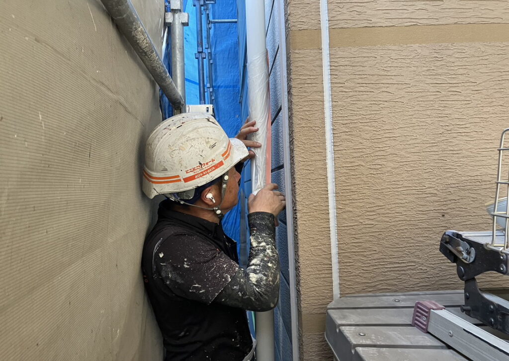 現場親方ブログ2023.07.27尼崎市 Y様邸 養生の様子養生こんにちは!宝塚尼崎店です。本日は尼崎市にお住いのY様邸で 養生を行っております。塗料が付着しないように狭い所もしっかりと養生を行っていきます。隙間があったら そこから塗料が付いてします恐れもあるので 隙間なく養生します!!プライマー塗布