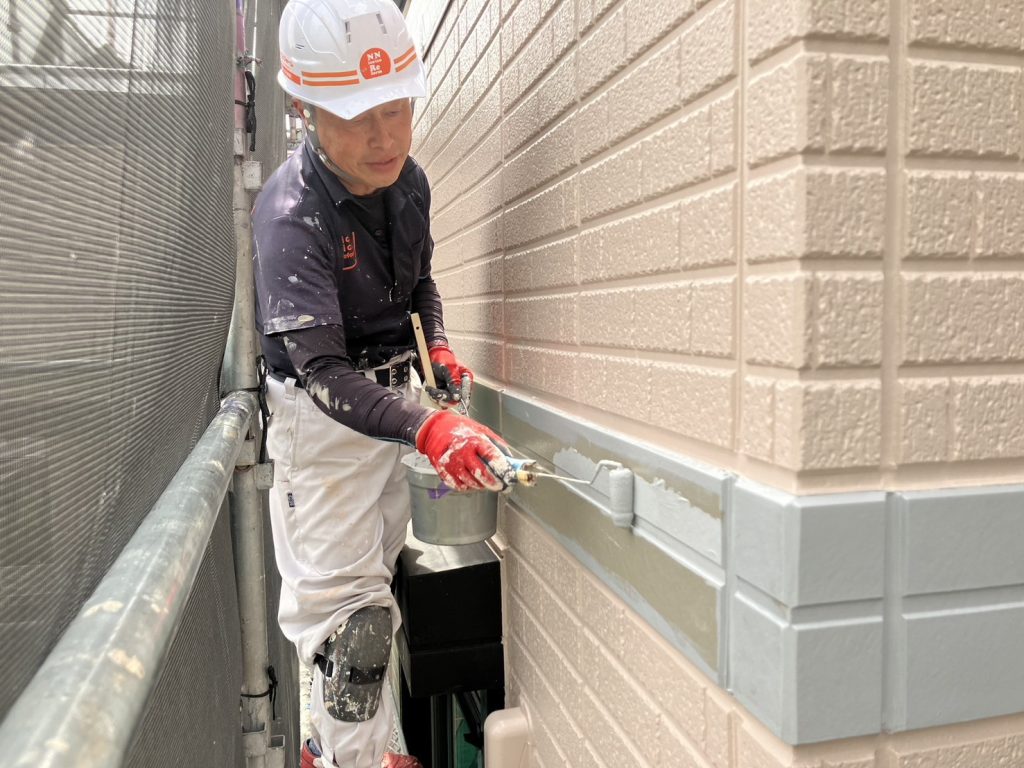 現場親方ブログ2025.05.15宝塚市 K様邸 外壁上塗り上塗りこんにちは!にこにこリフォーム宝塚尼崎店です!本日は外壁上塗りを行いました。午前中は北本君一人で頑張ってくれて、午後から谷田親方も合流して帯の中塗りを行いました。どんどん仕上がっています!