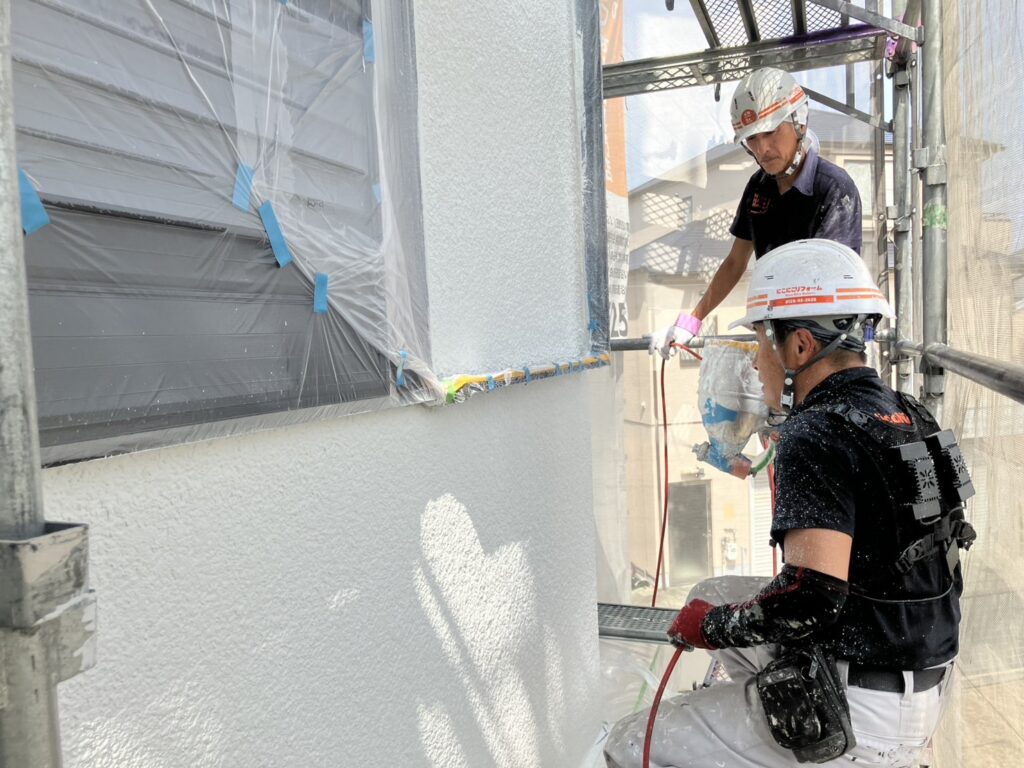 現場親方ブログ2025.07.16宝塚市 Y様邸 外壁吹き付け吹き付け塗装 上塗りこんにちは!にこにこリフォーム 宝塚尼崎店です!本日は石調塗装上塗りを行いました。中塗りでしっかりと色を付けてから吹き付けで上塗りを行っているところです。写真では分かりにくいですがとてもキラキラして綺麗です! シール職人の藤間さんも手伝ってくれて助かりました!