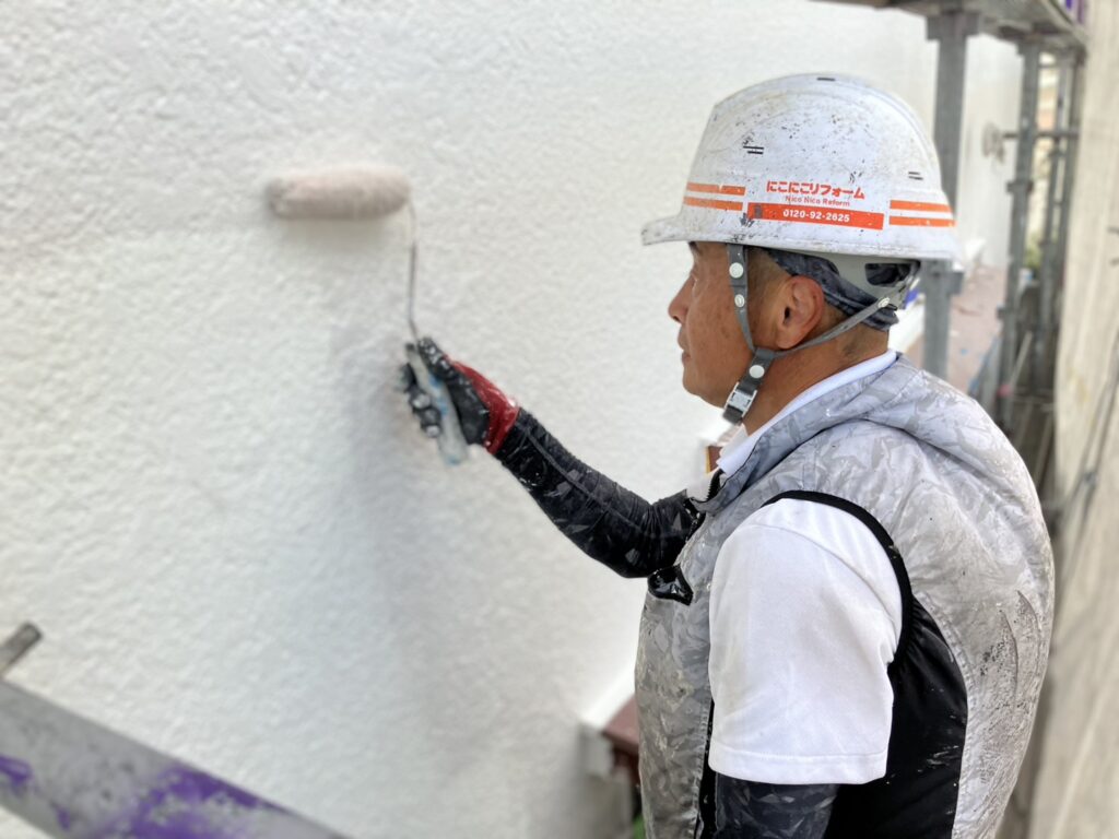 現場親方ブログ2025.08.07宝塚市 I様邸 外壁中塗り外壁中塗りこんにちは!にこにこリフォーム 宝塚尼崎店です!本日はI様邸にて外壁中塗りを行いました。今日は午前中雨が降ったので午後からの作業でした。暑い日が続いてましたが、今日は仕事がはかどりました!