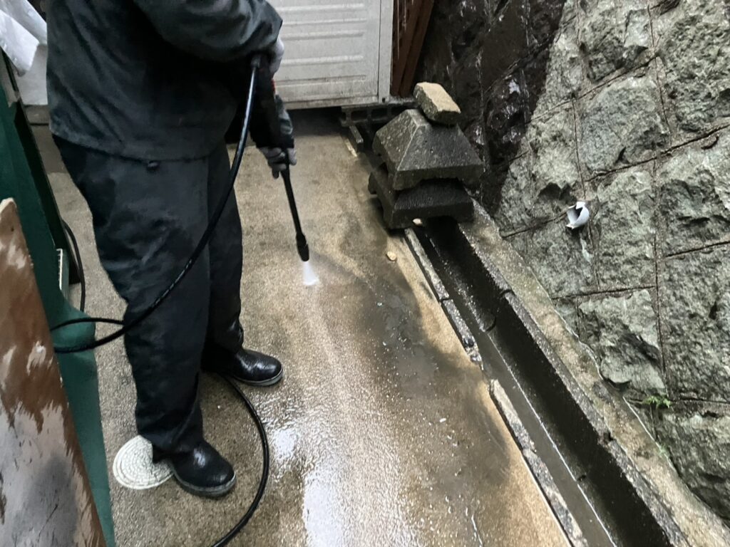 O様邸の足場解体が終わり、足場があって出来なかった土間、擁壁の高圧洗浄を行いました。