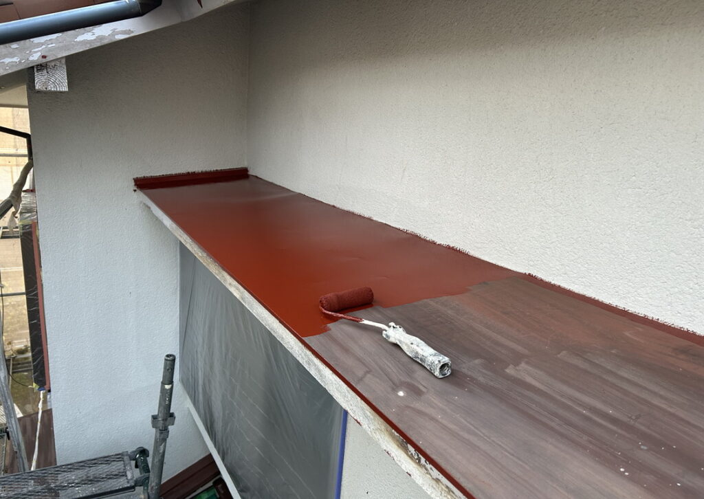 外壁屋根塗装同様、全体をしっかり高圧洗浄とケレンをしたら、1回目の塗装です。下塗り(したぬり)といいますが鉄部の場合は。さび止めをぬります。外壁塗装同様、原則、下塗り(さび止め)、中塗り、仕上げ塗り(上塗り)の3回です。(下写真)