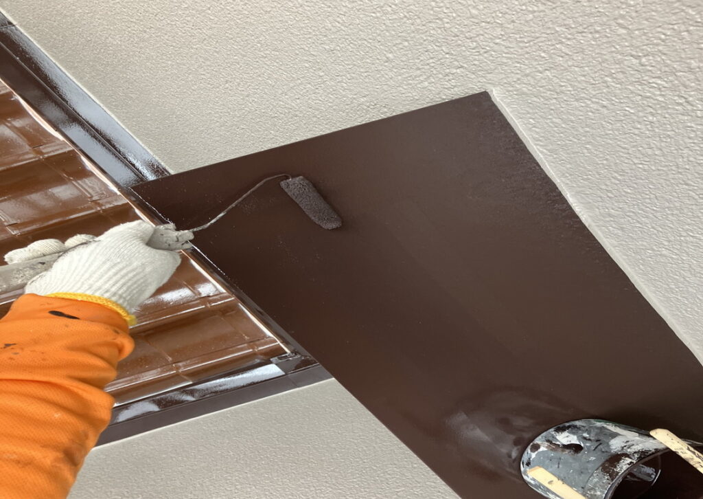 そして、次は、いよいよ中塗りです。今回は、お客様が選んでくれた茶色ですね。塗料は関西ペイントのアレスダイナミックTOPです。