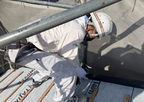 現場親方ブログ屋根工事 こんにちは!屋根班です 本日は神戸市にお住いのS様のお宅にて屋根工事を行っております。 写真は棟撤去 ルーフイング貼り 唐草取付を行っている場面です