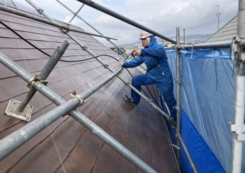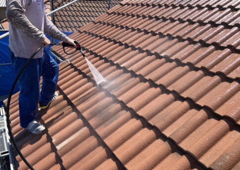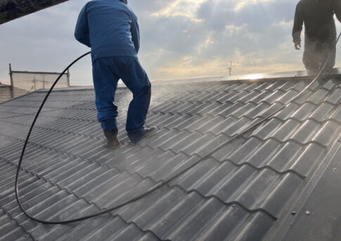 現場親方ブログ高圧洗浄 こんにちは にこにこ伊丹店です。 本日は伊丹市にお住いのM様のお宅にて 屋根の高圧洗浄を行っております。 長年の汚れをしっかりと洗い流していきます。 本日もご安全に!!