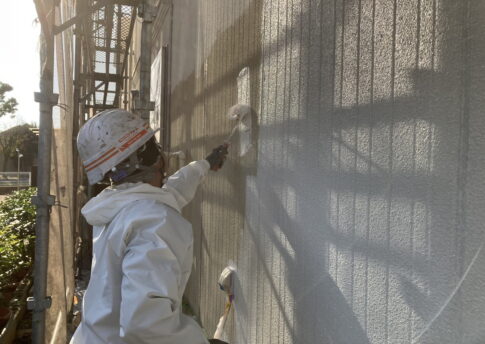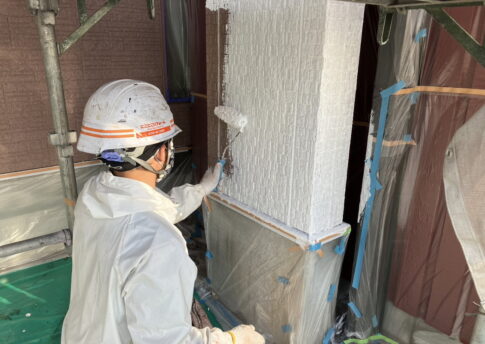 現場親方ブログ外壁下塗り こんにちは!にこにこ伊丹店です 本日は伊丹市にお住いのT様のお宅にて外壁の下塗りを行っております。 目に見えない傷等下塗り材で補修しております。