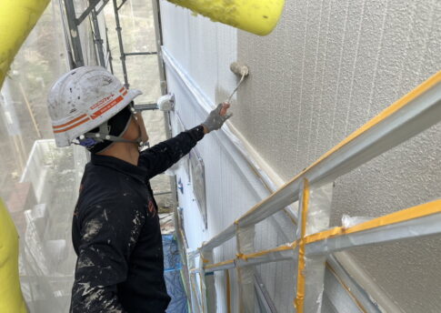 現場親方ブログ外壁中塗り こんにちは!にこにこ伊丹店です 本日は伊丹市にお住いのK様のお宅にて外壁の中塗りを行っております。 丁寧に隅々まで塗料の効果が出る厚さになるように塗っていきます