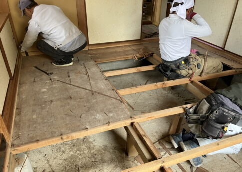 現場親方ブログ床板張り替え こんにちは!リフォーム班です 本日は猪名川町伏見台にお住いのS様のお宅にて床板貼り替えを行っております。 畳を丁寧に外して床板を張り替えております。!