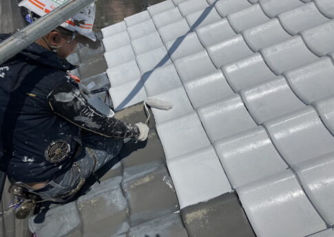 現場親方ブログ屋根塗装 こんにちは!にこにこ三田店です 本日は三田市にあかしあ台におすまいのG様のお宅にて 遮熱・放熱の効果のある観音シリコン塗料の上塗りを行っております。 隅々まで丁寧に塗っております