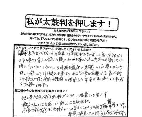 口コミ評判宝塚市 H様 お客様の口コミをご紹介! Q. どうしてにこにこリフォームを選んでくださいましたか? 親戚の紹介 Q. 施工後の今のお気持ちをお聞かせください。 満足です 「この度はにこにこリフォームにご依頼いただきありが...