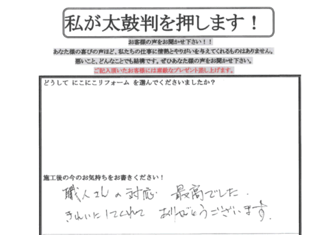 口コミ評判神戸市北区 T様 お客様の口コミをご紹介! Q. どうしてにこにこリフォームを選んでくださいましたか? 3社に見積をしていただきました。 その中で「にこにこリフォーム」が1番良かったので選びました。 Q. 施工後の今のお...