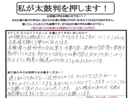 口コミ評判川西市 Y様 お客様の口コミをご紹介! Q. どうしてにこにこリフォームを選んでくださいましたか? 近隣で時々外壁塗装をされているのと川西猪名川店の前を車で通っていたので名前は知っていました。他社と相見積もりを取る予定で...