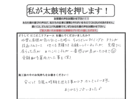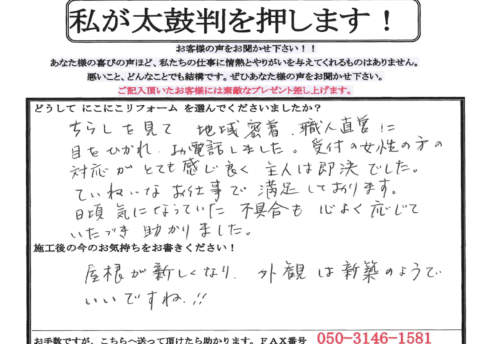 口コミ評判尼崎市 K様 お客様の口コミをご紹介! Q. どうしてにこにこリフォームを選んでくださいましたか? 外壁と屋根が気になっていた時に、ちょうどいいタイミングでチラシが投函されていて、他にも見積りをお願いしていましたが、見積...