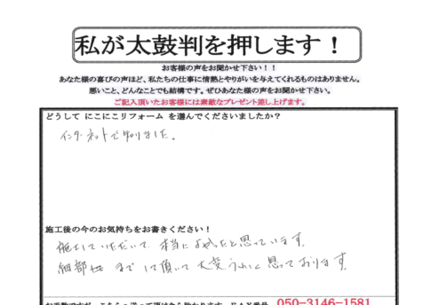 口コミ評判三田市 Y様 お客様の口コミをご紹介! Q. どうしてにこにこリフォームを選んでくださいましたか? チラシを見て、高田さんに来ていただいたところ、妻と同じ出身校だとわかり、「にこにこリフォーム」にしました。また高田さんの...