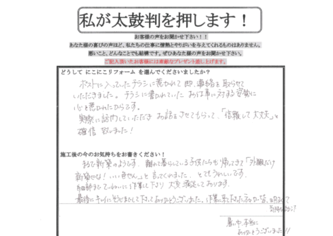 口コミ評判宝塚市 T様 お客様の口コミをご紹介! Q. どうしてにこにこリフォームを選んでくださいましたか? ポストに入っていたチラシに惹かれて即、連絡を取らせていただきました。チラシに書かれていたお仕事に対する姿勢に心を惹かれた...