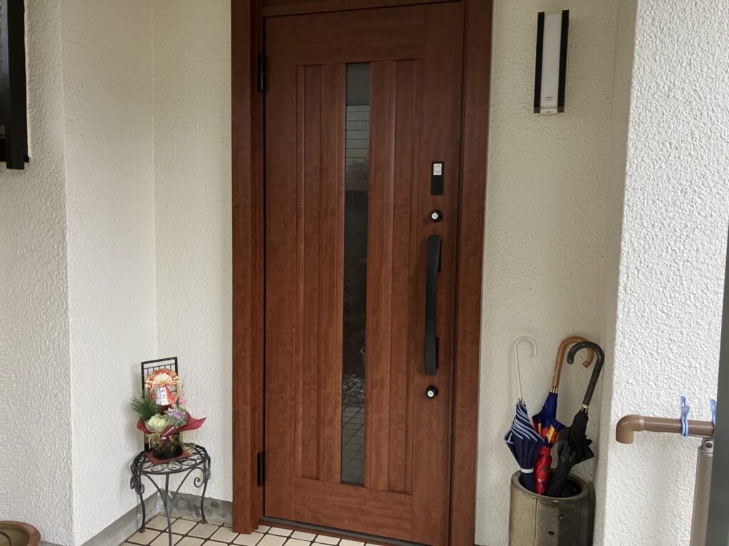落ち着きのある木目調デザインの洋風玄関ドアへと生まれ変わり、住まい全体の印象がぐっと明るくなりました。