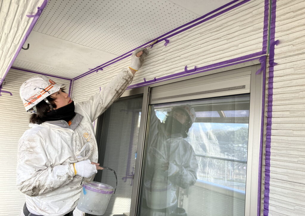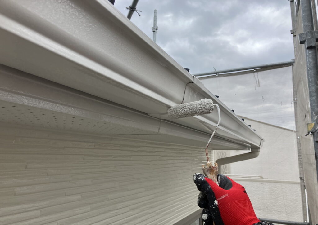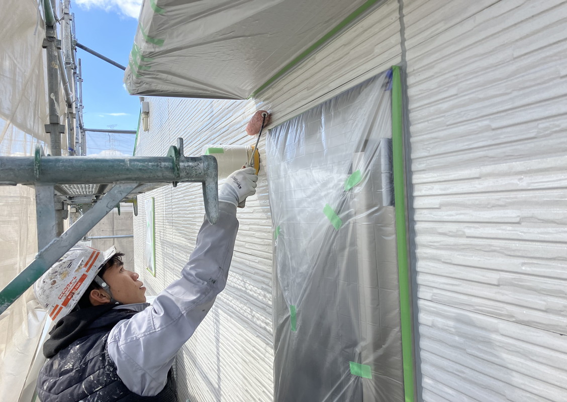 きれいに下塗り材の上に色がのっていきます。しかし、傷んだ外壁の場合は、外壁材に吸い込まれていくこともあり、規定以上のたくさんの塗料を使うこともあります。綺麗に長持ちするように心込めて塗ります。