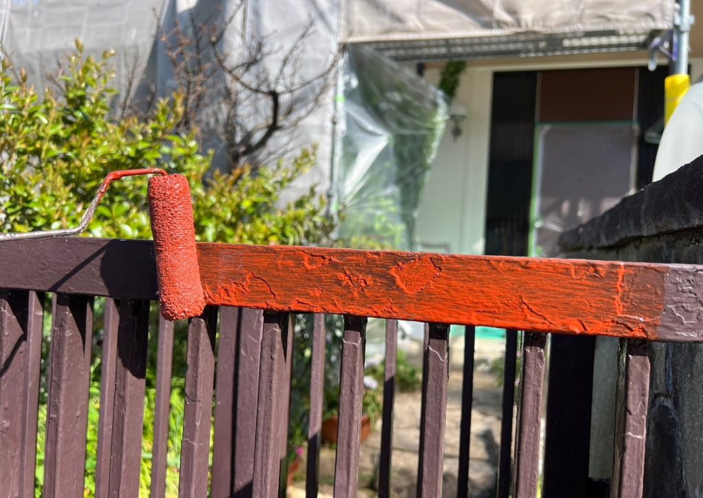 外壁屋根塗装同様、全体をしっかり高圧洗浄とケレンをしたら、1回目の塗装です。下塗り(したぬり)といいますが鉄部の場合は。さび止めをぬります。外壁塗装同様、原則、下塗り(さび止め)、中塗り、仕上げ塗り(上塗り)の3回です。(下写真)