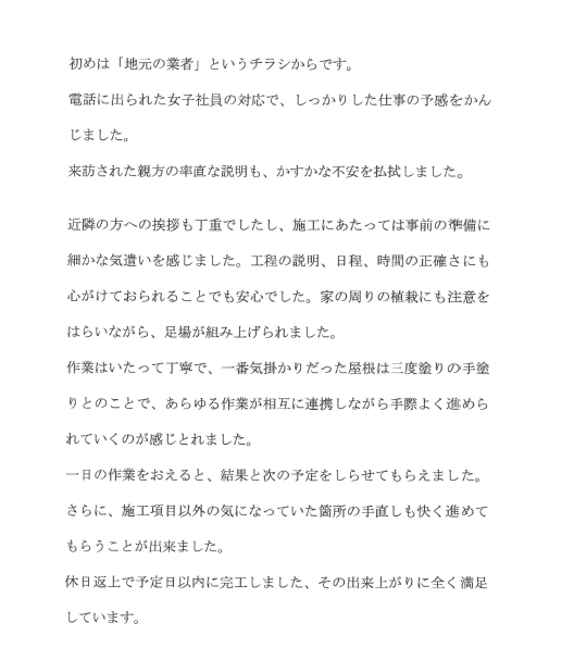 近隣の方への挨拶も丁重でしたし、施工にあたっては事前の準備に細やかな気遣いを感じました。