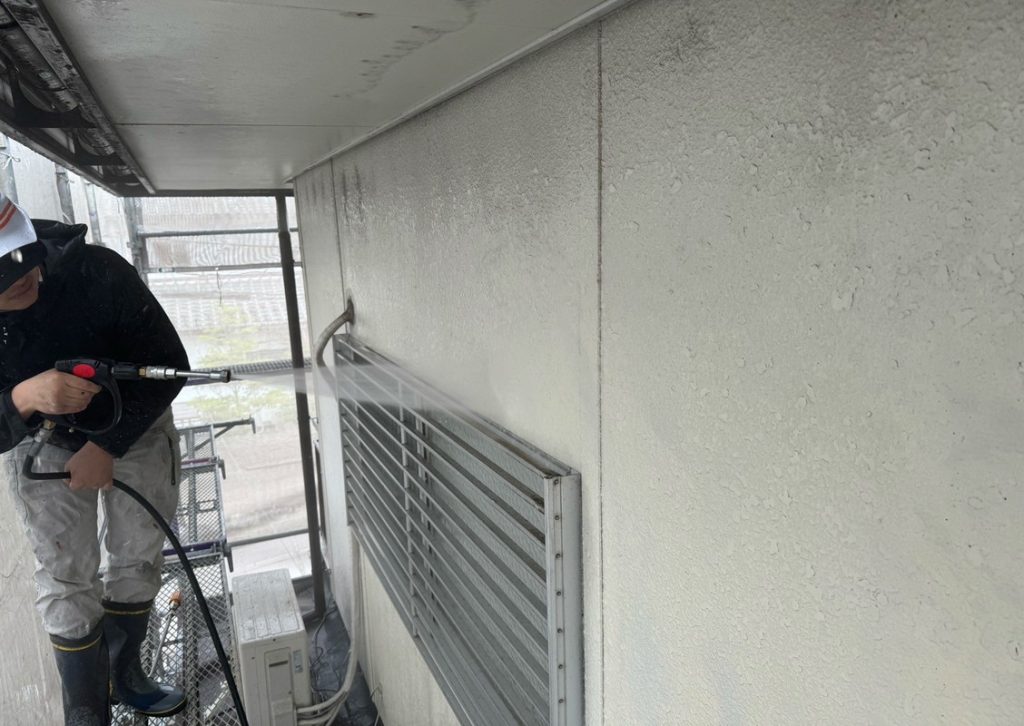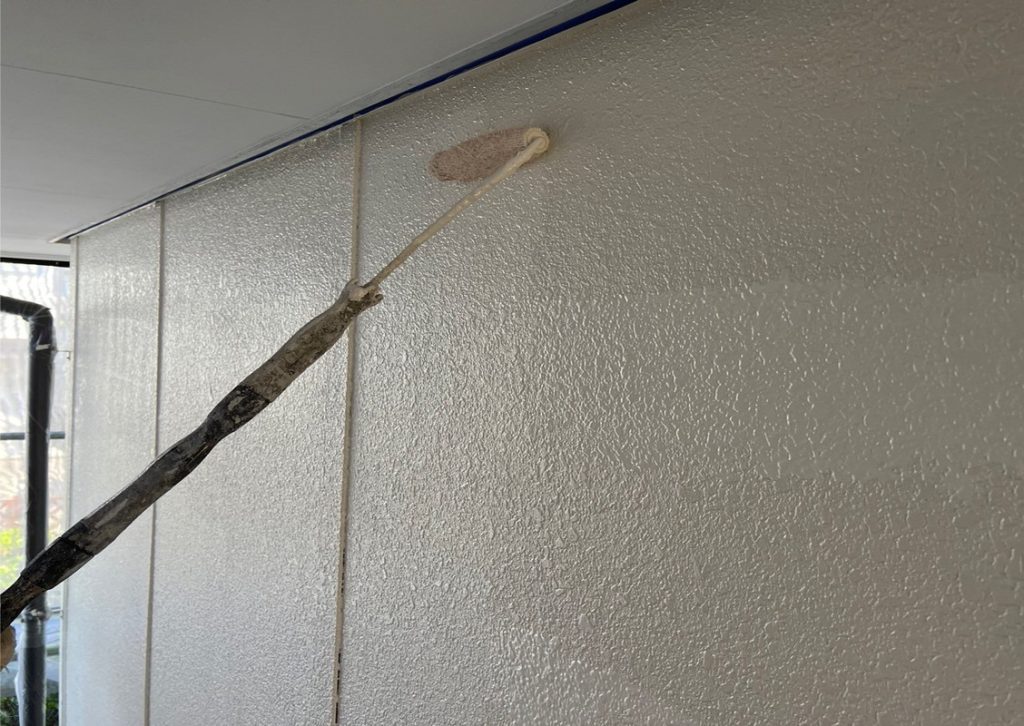 全体をしっかり高圧洗浄したら、1回目の塗装です。下塗り(したぬり)といいます。外壁の種類により、下塗り塗料はシーラとフィラーと2種類の下塗り塗料に分かれますが下地材に適した塗料を使用します。原則、下塗り、中塗り、仕上げ塗り(上塗り)をしっかり、たっぷり 3回塗りです。吸い込みが激しい場合は2回塗る時もあります。