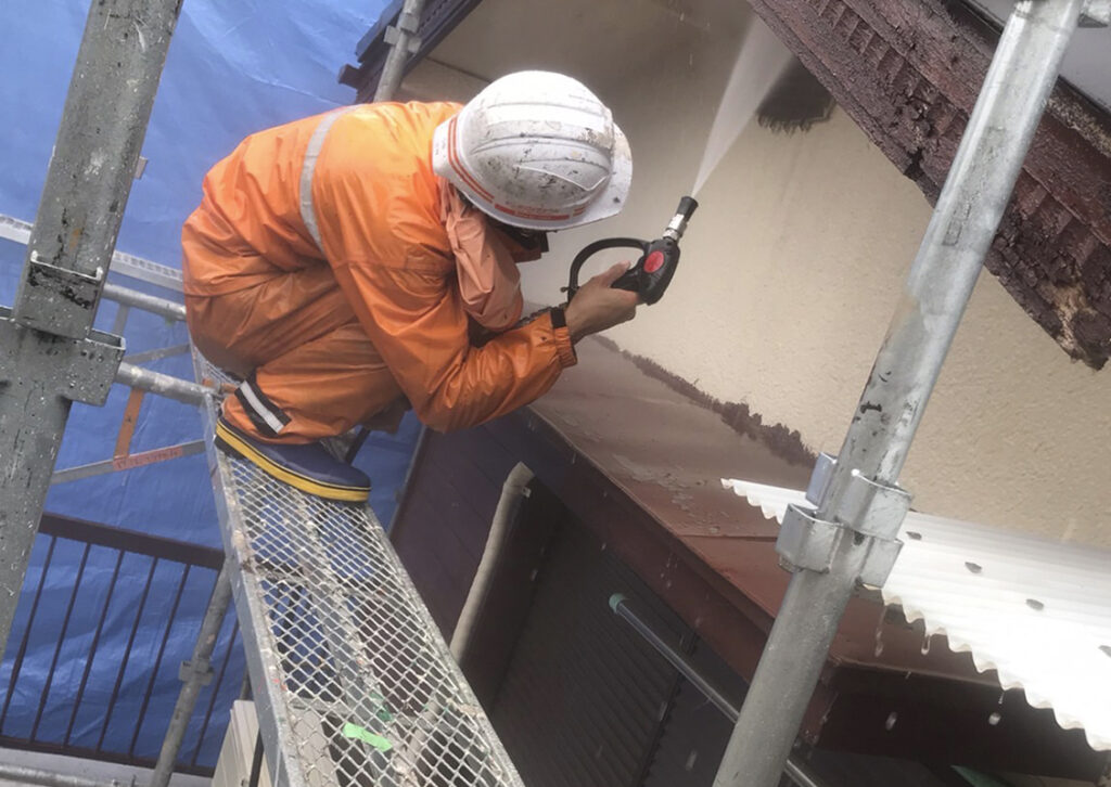 まず、塗装の前に高圧洗浄で、コケや汚れ、黒ずみ、旧塗膜等をしっかり落としていきます!高圧洗浄でしっかりと旧塗膜や汚れを落としておくことで、塗料の密着性を良くする効果を発揮できるからです。