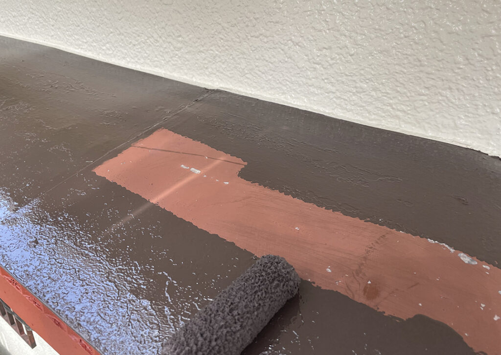 外壁屋根塗装同様、全体をしっかり高圧洗浄とケレンをしたら、1回目の塗装です。下塗り(したぬり)といいますが鉄部の場合は。さび止めをぬります。外壁塗装同様、原則、下塗り(さび止め)、中塗り、仕上げ塗り(上塗り)の3回です。(下写真)