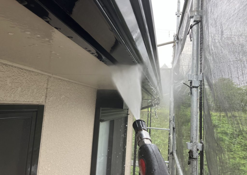 まず、塗装の前に高圧洗浄で、コケや汚れ、黒ずみ、旧塗膜等をしっかり落としていきます!高圧洗浄でしっかりと旧塗膜や汚れを落としておくことで、塗料の密着性を良くする効果を発揮できるからです。外壁屋根が綺麗になっていくに様子は感動の塗り替えリフォームの始まりです。夏はとても楽しい仕事でもありますが、寒い冬は身体もびしょ濡れになり大変な作業でもあります。が職人さんは外壁から屋根にあがり手際よく作業していきます。