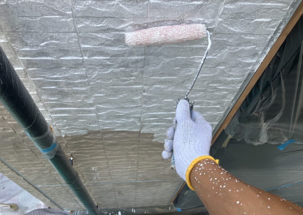 全体をしっかり高圧洗浄したら、1回目の塗装です。下塗り(したぬり)といいます。外壁の種類により、下塗り塗料はシーラとフィラーと2種類の下塗り塗料に分かれますが下地材に適した塗料を使用します。原則、下塗り、中塗り、仕上げ塗り(上塗り)をしっかり、たっぷり 3回塗りです。吸い込みが激しい場合は2回塗る時もあります。