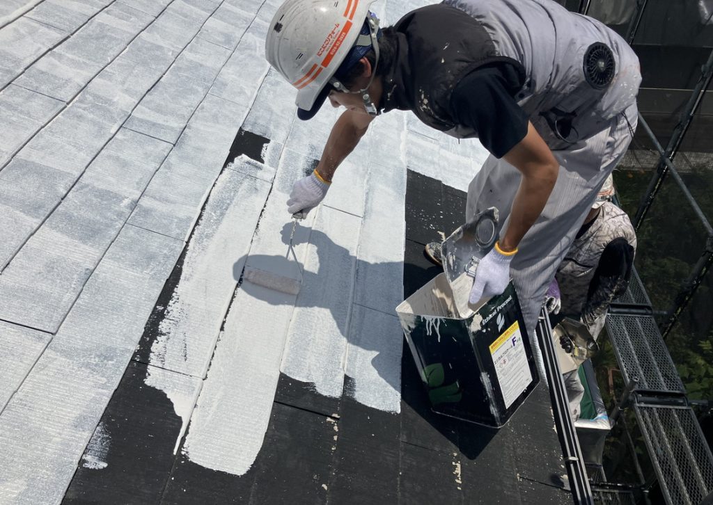 そして、次は、いよいよ中塗り(なかぬり)です。外壁の色は、イーサンクのエシカルプロクールSi、052(上部)、054(帯部分)、043(下部)いずれも5分艶、屋根もイーサンクのエシカルプロクールSi、104、5分艶です。傷んだ外壁の場合は、外壁材に吸い込まれていくことも多くあり、規定以上のたくさんの塗料を使うこともあります。綺麗に長持ちするように心込めて塗ります。