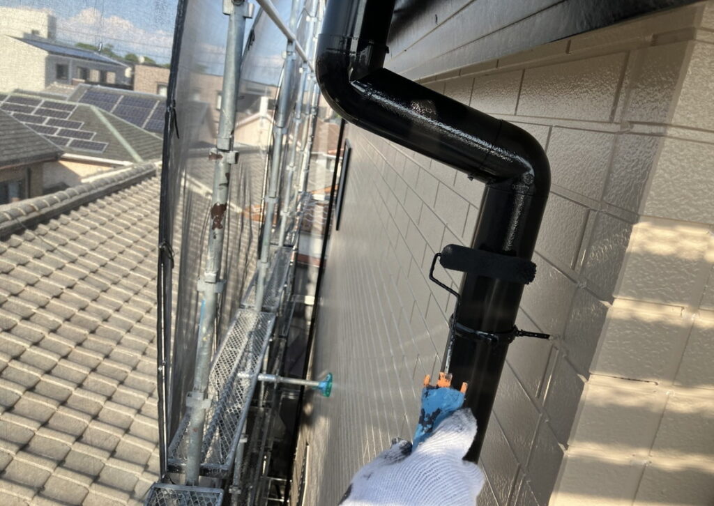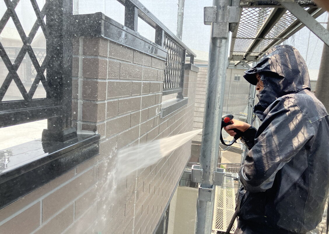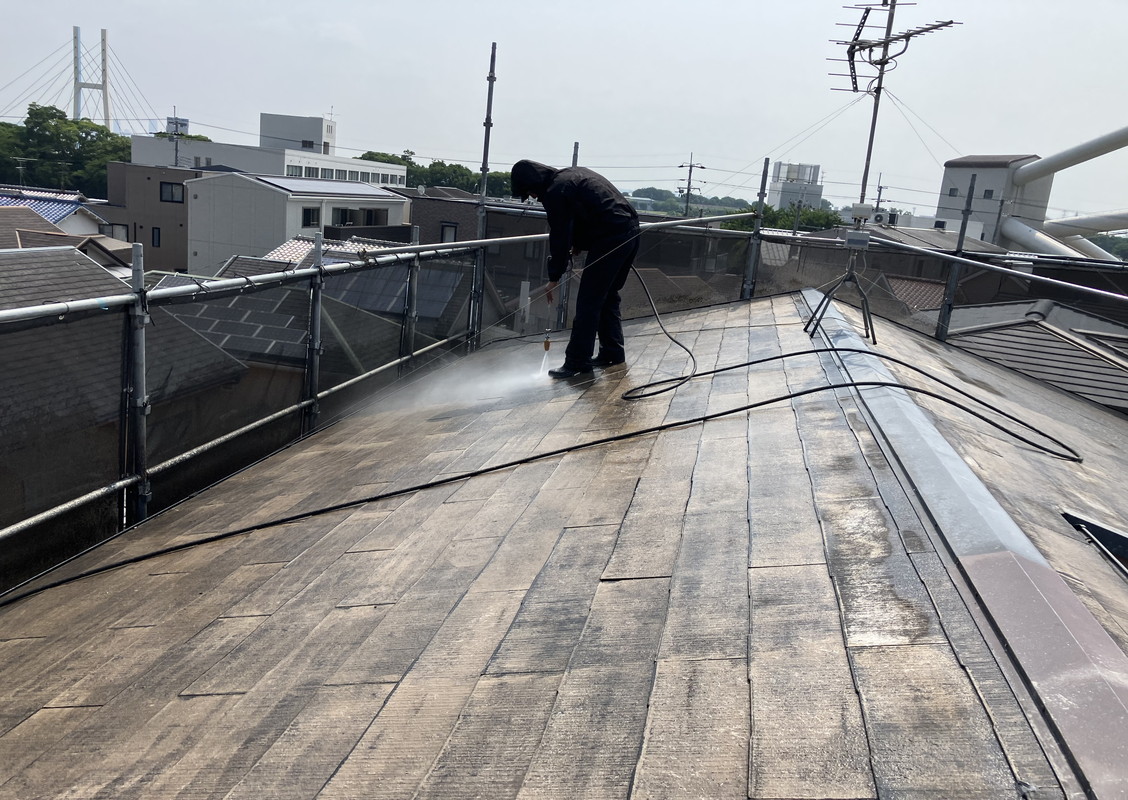 塗装の前に高圧洗浄で、コケや汚れ、黒ずみ、旧塗膜等をしっかり落としていきます!高圧洗浄でしっかりと旧塗膜や汚れを落としておくことで、塗料の密着性を良くする効果を発揮できるからです。
