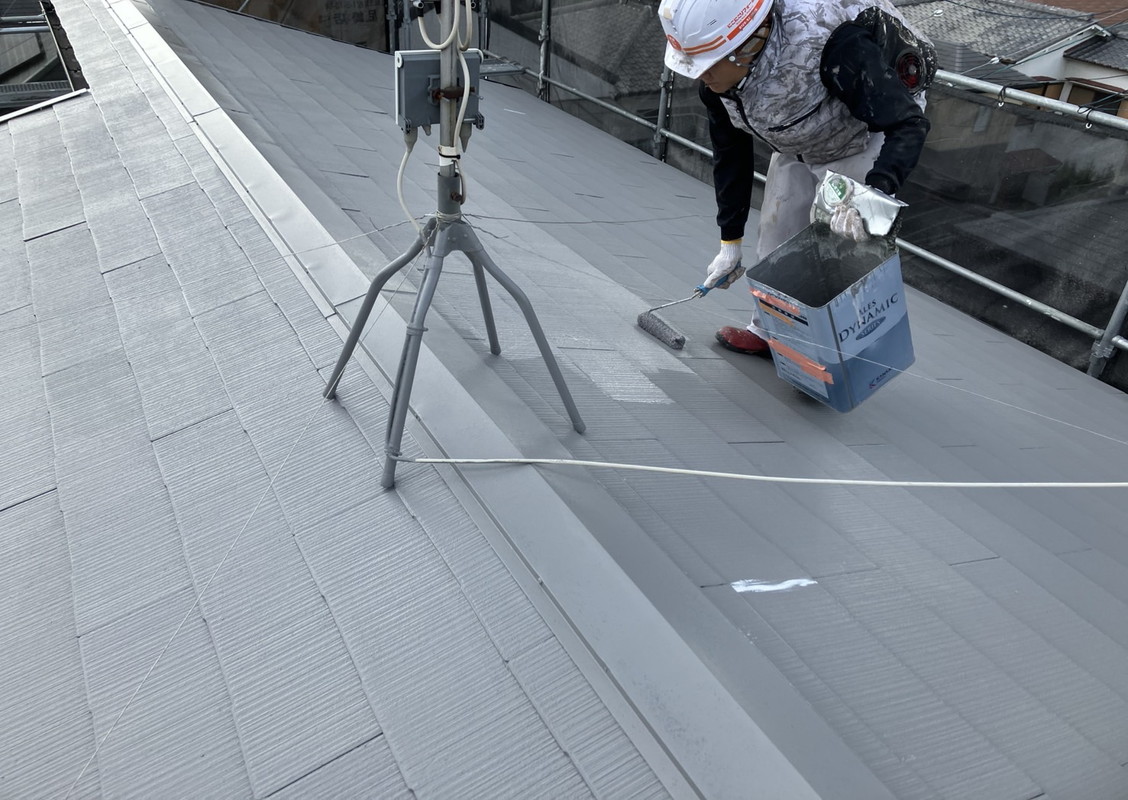 そして、次は、いよいよ中塗りです。外壁の塗料はアレスダイナミックトップの艶有り、色はKP-357、そして屋根は観音シリコンの5分艶、色はNKP-074です。