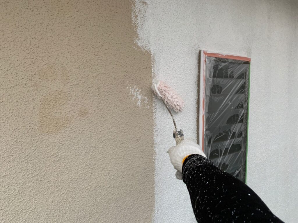 全体をしっかり高圧洗浄したら、1回目の塗装です。下塗り(したぬり)といいます。単層と複層塗料の違いで工程が変わる場合がありますが、原則、下塗り、中塗り、仕上げ塗り(上塗り)の3回です。