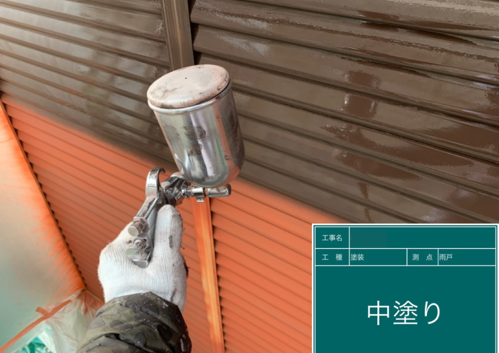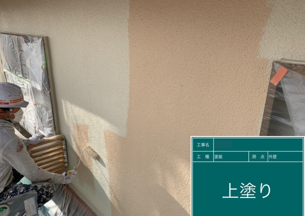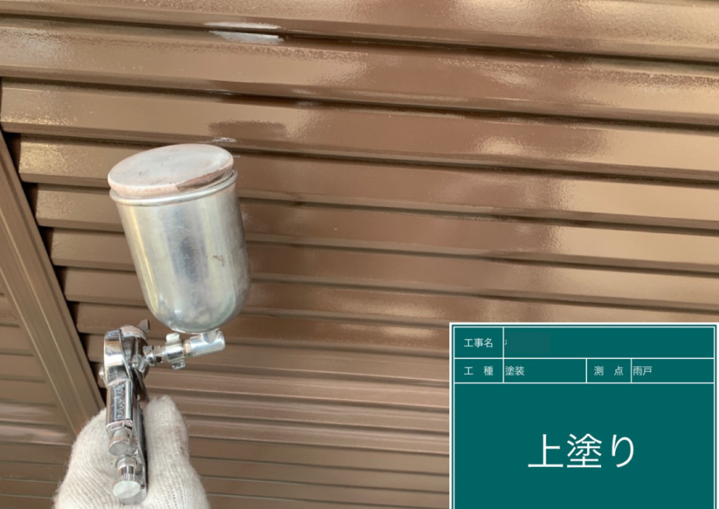 そして、いよいよ仕上げ塗り(上塗り-うわぬり)です。時には中塗りでしっかりと塗ったのに、経年劣化等により、傷みが激しい場合には、中塗りでもまだ下が透けてしまうこともあります。