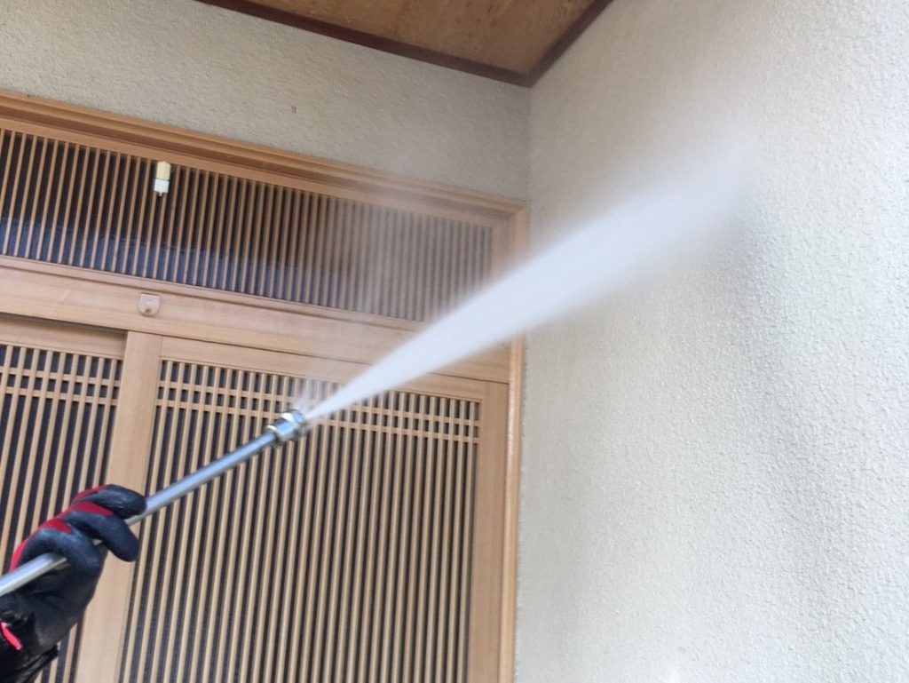 まず、塗装の前に高圧洗浄で、コケや汚れ、黒ずみ、旧塗膜等をしっかり落としていきます!高圧洗浄でしっかりと旧塗膜や汚れを落としておくことで、塗料の密着性を良くする効果を発揮できるからです。