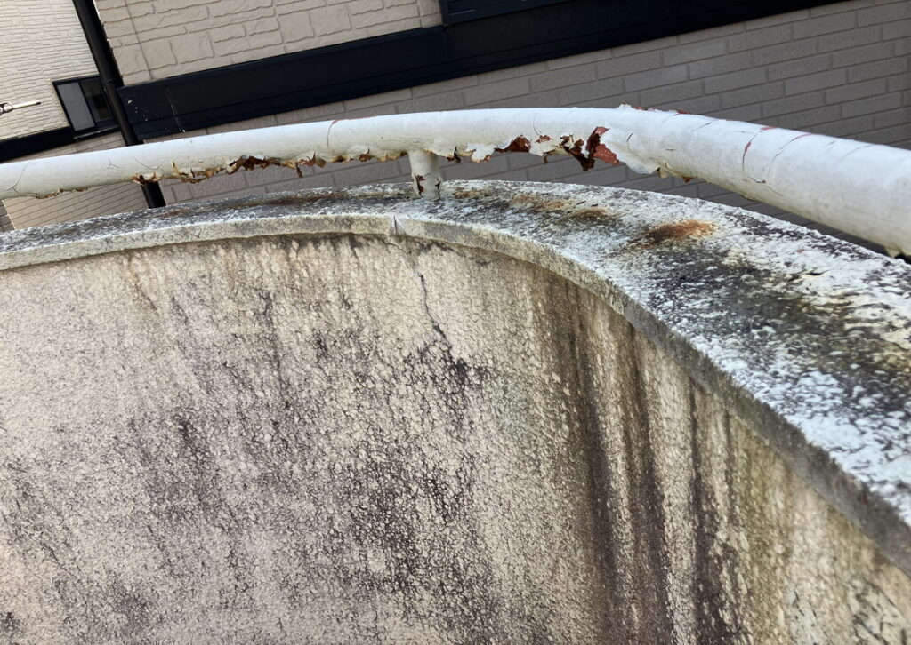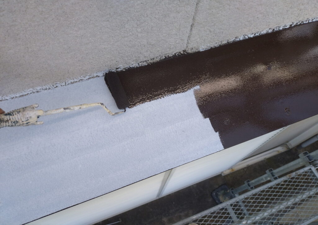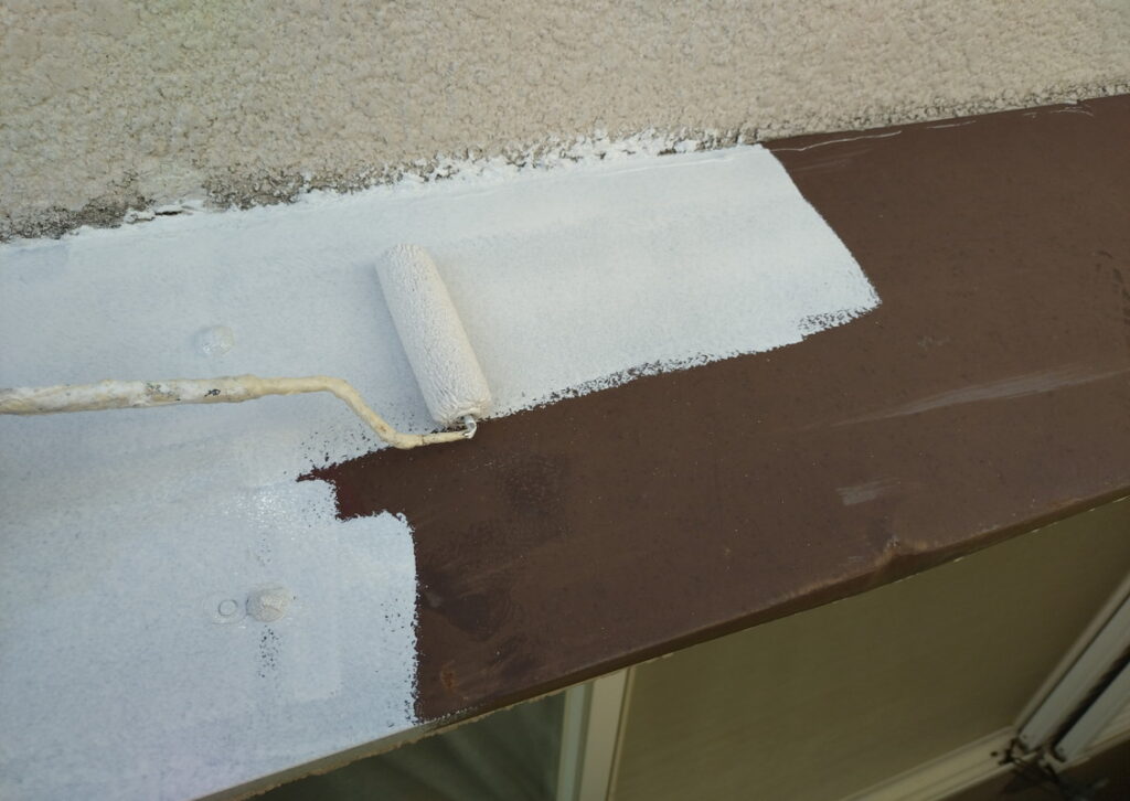 外壁屋根塗装同様、全体をしっかり高圧洗浄とケレンをしたら、1回目の塗装です。下塗り(したぬり)といいますが鉄部の場合は。さび止めをぬります。外壁塗装同様、原則、下塗り(さび止め)、中塗り、仕上げ塗り(上塗り)の3回です。(下写真)