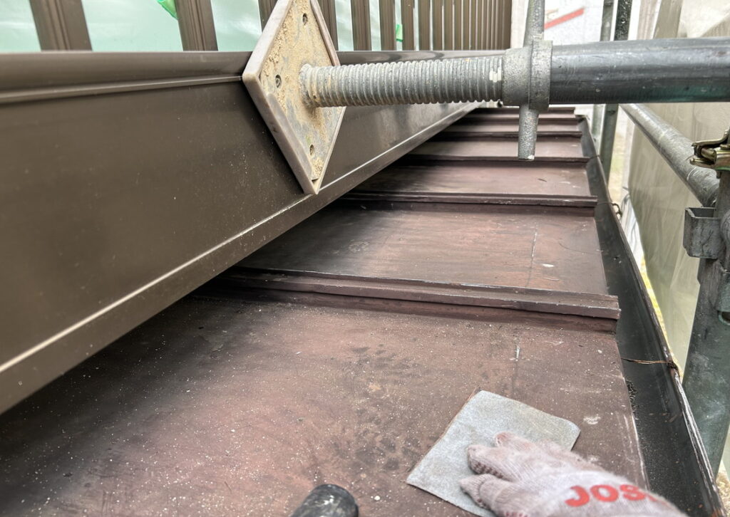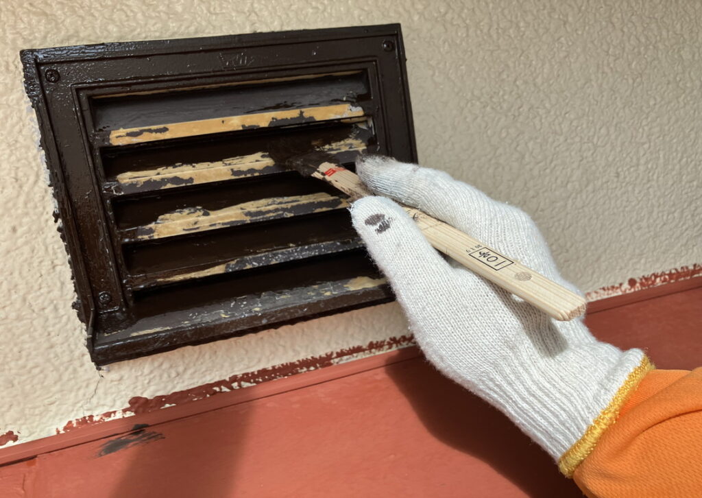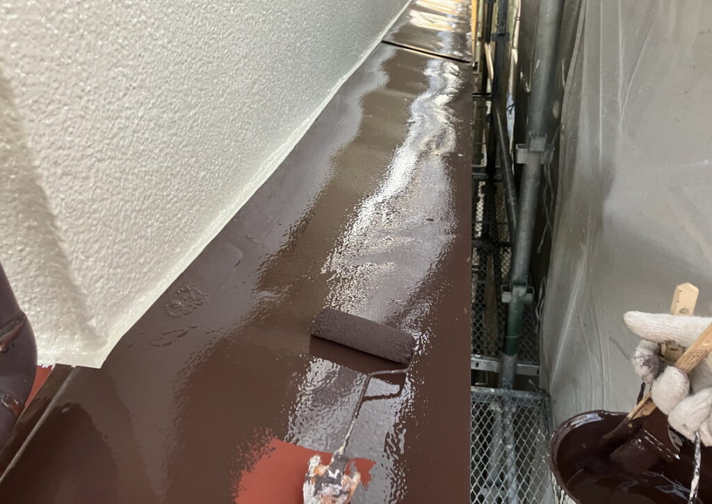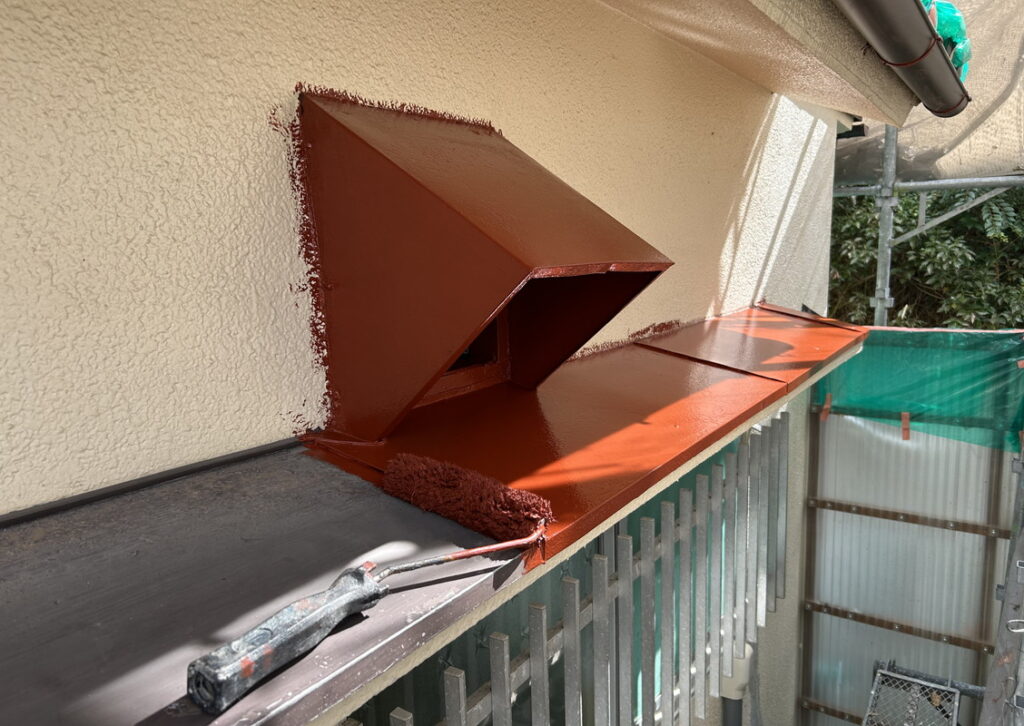 外壁屋根塗装同様、全体をしっかり高圧洗浄とケレンをしたら、1回目の塗装です。下塗り(したぬり)といいますが鉄部の場合は。さび止めをぬります。外壁塗装同様、原則、下塗り(さび止め)、中塗り、仕上げ塗り(上塗り)の3回です。(下写真)