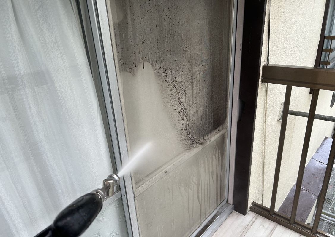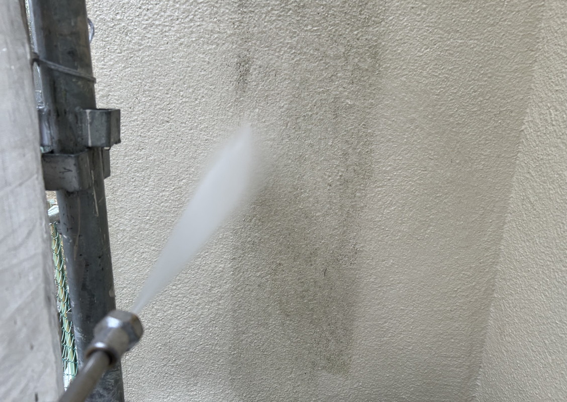 塗装の前に高圧洗浄で、コケや汚れ、黒ずみ、旧塗膜等をしっかり落としていきます!高圧洗浄でしっかりと旧塗膜や汚れを落としておくことで、塗料の密着性を良くする効果を発揮できるからです。