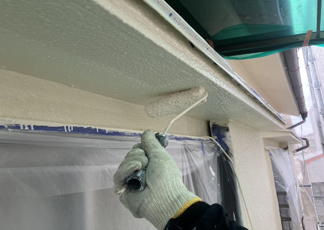 そして、次は、いよいよ中塗りです。今回は、お客様が選んでくれたクリーム色ですね。塗料は外壁にこにこ観音シリコンです。