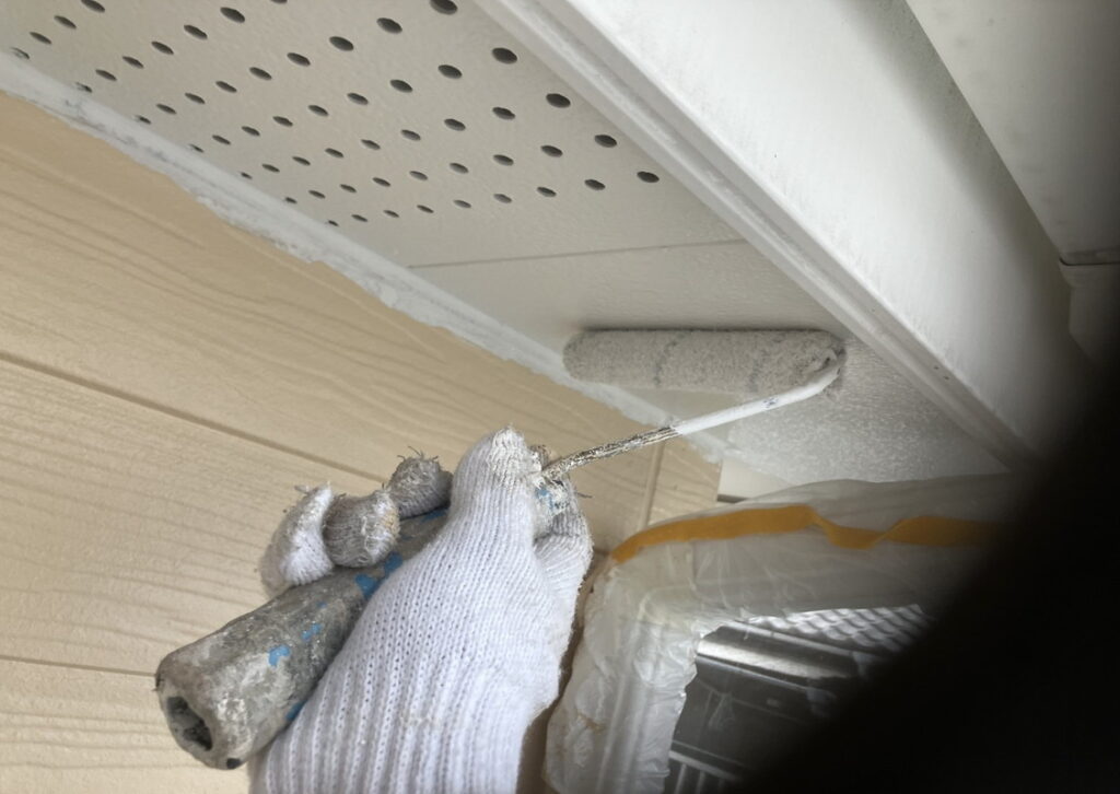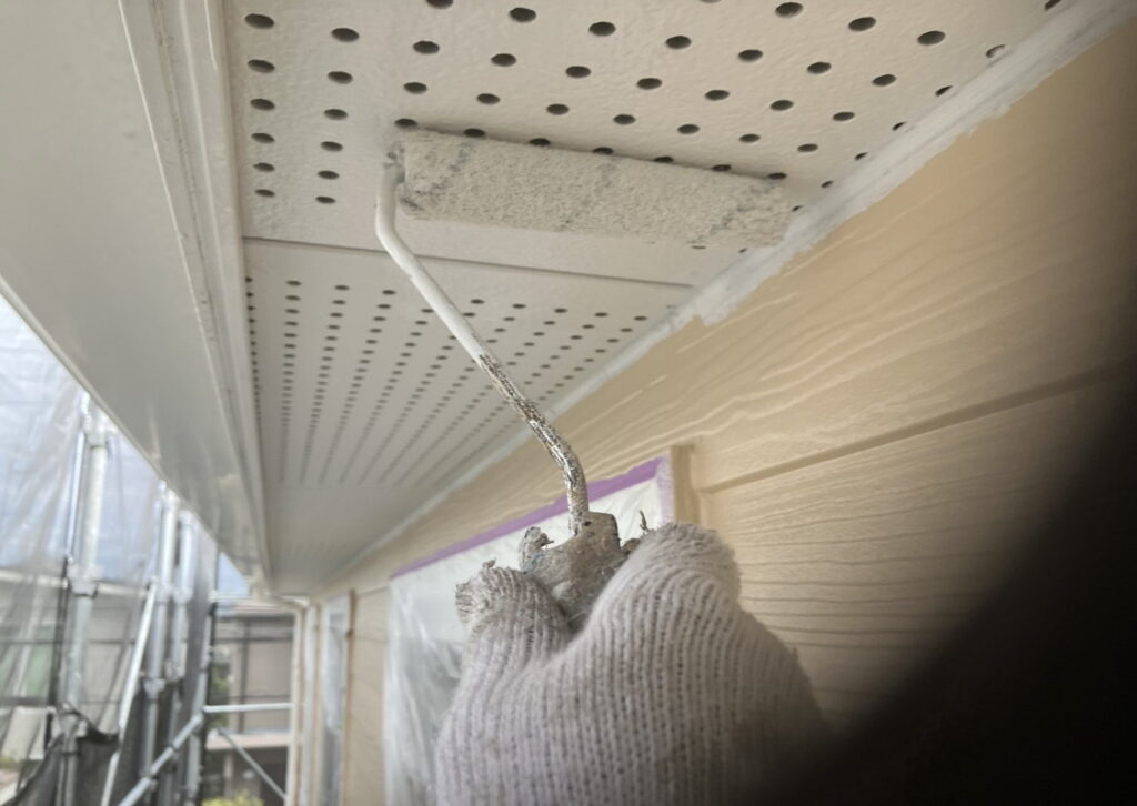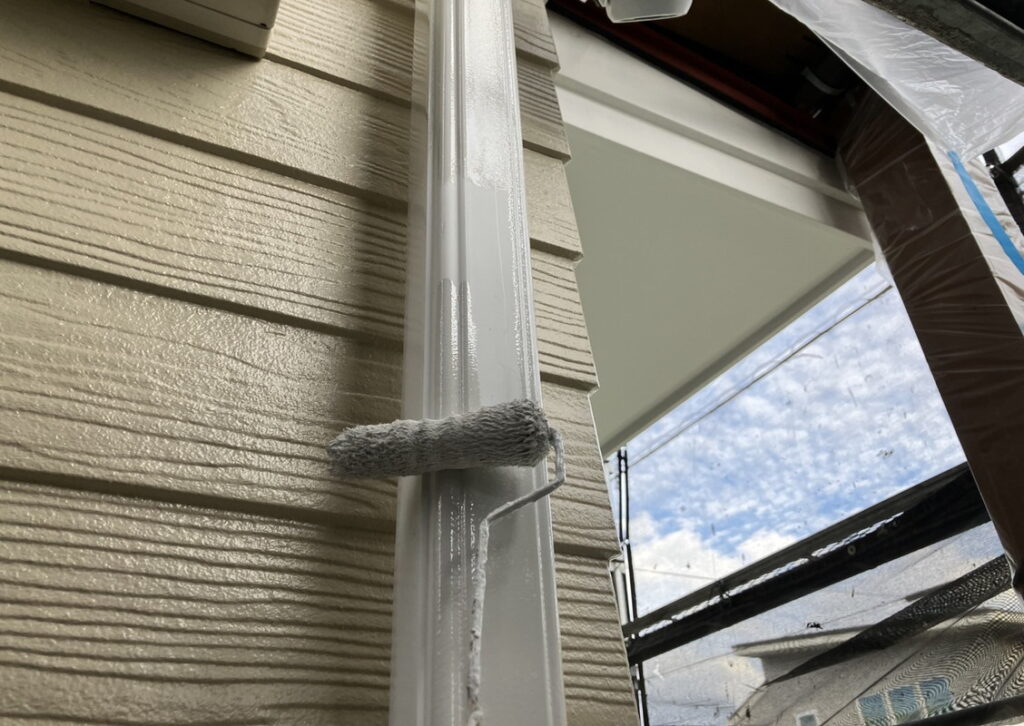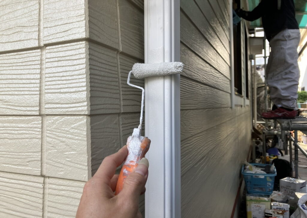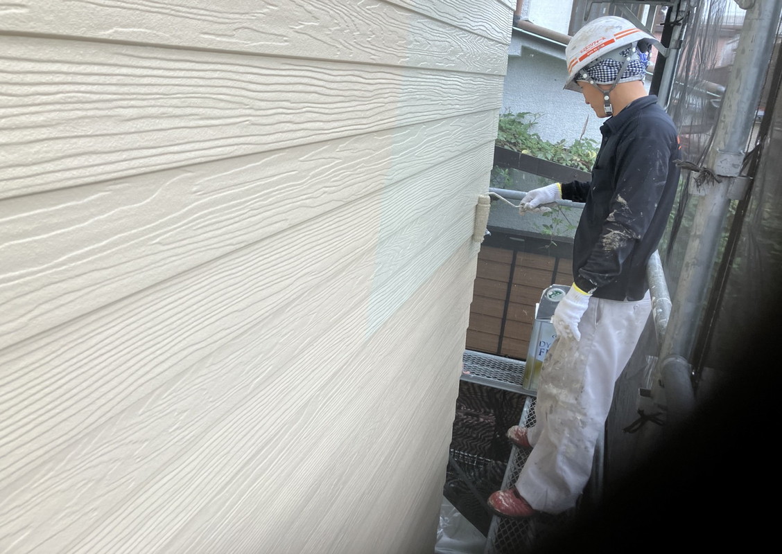 きれいに下塗り材の上に色がのっていきます。しかし、傷んだ外壁の場合は、外壁材に吸い込まれていくこともあり、規定以上のたくさんの塗料を使うこともあります。綺麗に長持ちするように心込めて塗ります。