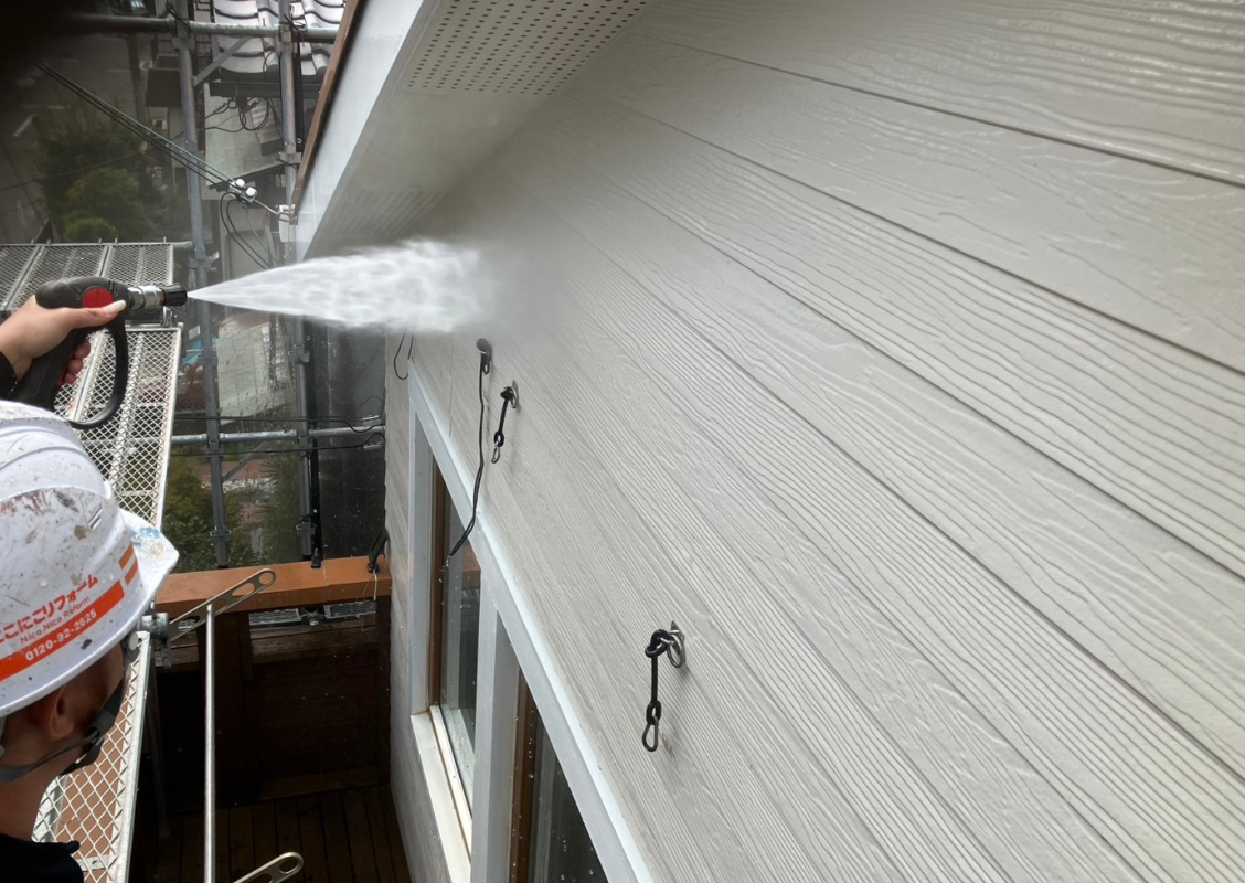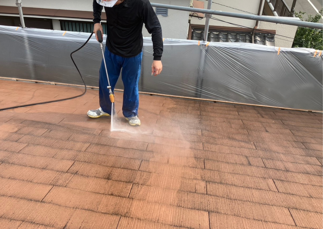 塗装の前に高圧洗浄で、コケや汚れ、黒ずみ、旧塗膜等をしっかり落としていきます!高圧洗浄でしっかりと旧塗膜や汚れを落としておくことで、塗料の密着性を良くする効果を発揮できるからです。