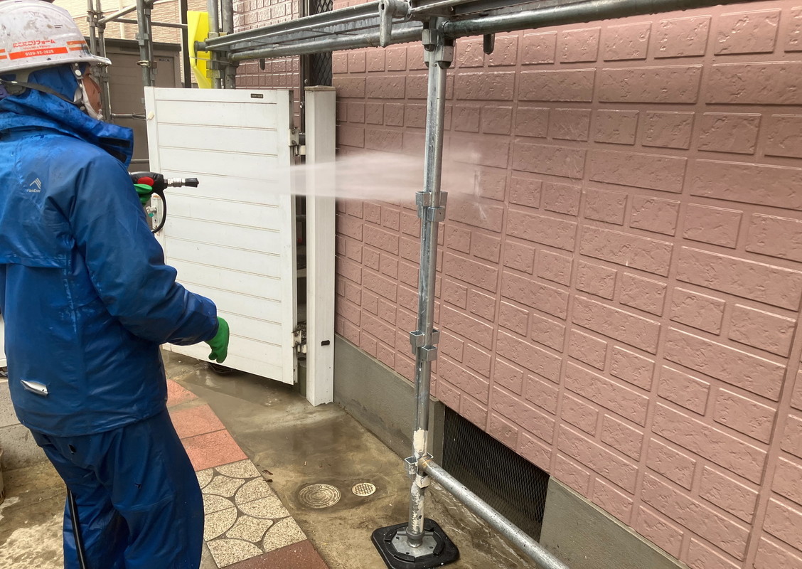 塗装の前に高圧洗浄で、コケや汚れ、黒ずみ、旧塗膜等をしっかり落としていきます!高圧洗浄でしっかりと旧塗膜や汚れを落としておくことで、塗料の密着性を良くする効果を発揮できるからです。