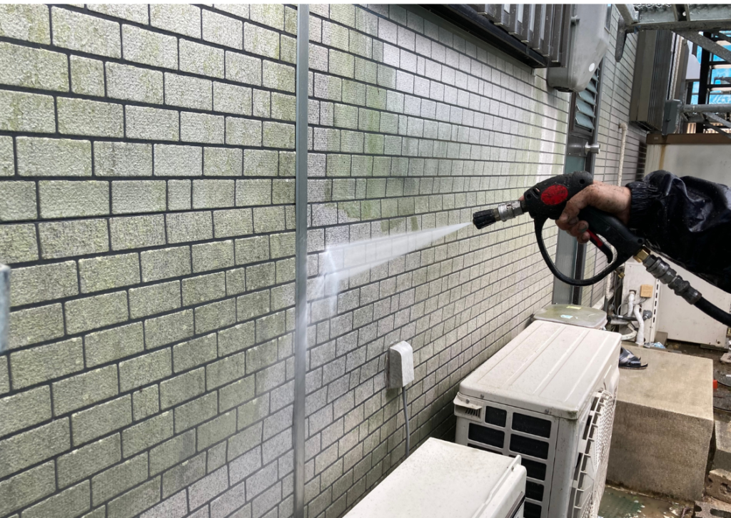まず、塗装の前に高圧洗浄で、コケや汚れ、黒ずみ、旧塗膜等をしっかり落としていきます!高圧洗浄でしっかりと旧塗膜や汚れを落としておくことで、塗料の密着性を良くする効果を発揮できるからです。
