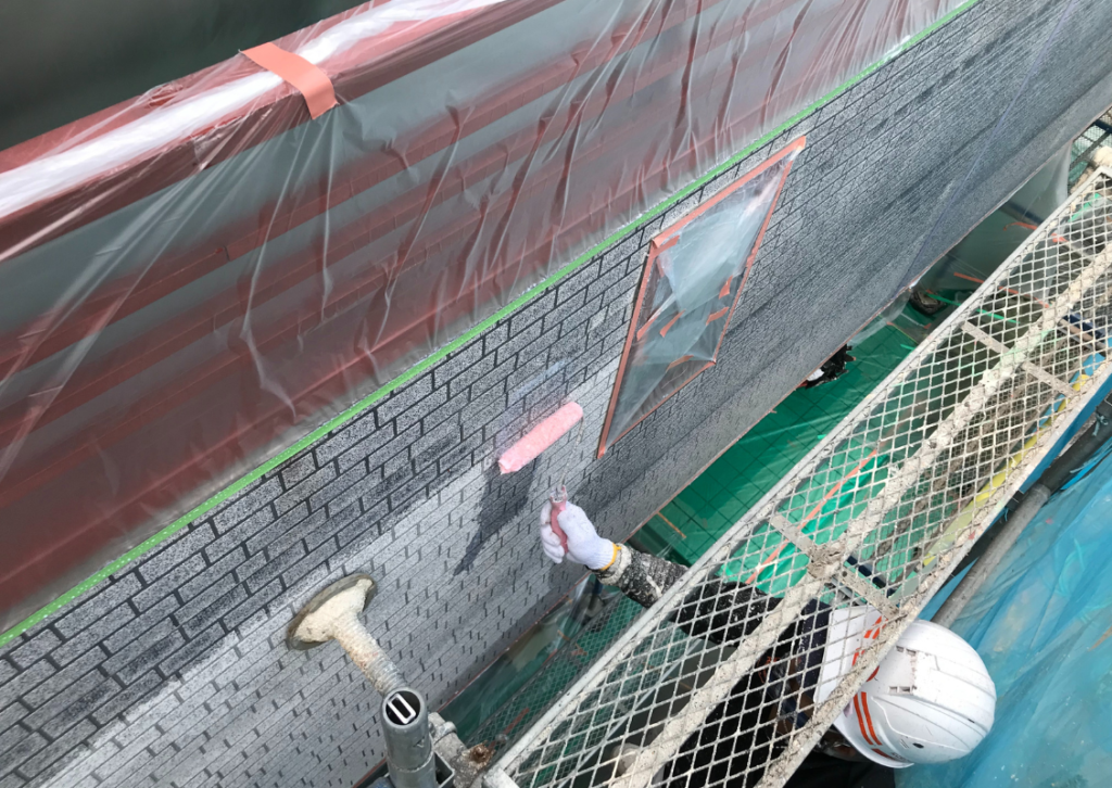 全体をしっかり高圧洗浄したら、1回目の塗装です。下塗り(したぬり)といいます。単層と複層塗料の違いで工程が変わる場合がありますが、原則、下塗り、中塗り、仕上げ塗り(上塗り)の3回です。