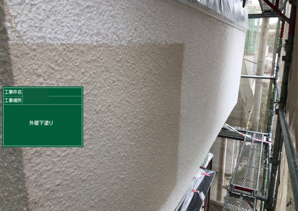 全体をしっかり高圧洗浄したら、1回目の塗装です。下塗り(したぬり)といいます。単層と複層塗料の違いで工程が変わる場合がありますが、原則、下塗り、中塗り、仕上げ塗り(上塗り)の3回です。